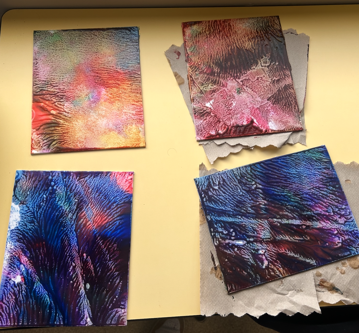 On the day of the event, the kids painted a large canvas on the floor using squeeze bottles filled with paint. The painted canvas was covered with a plastic sheet, and the kids could go over it with their wheelchairs, walkers, or feet to add design to the art! The canvas was stamped onto smaller canvases for the students to take home and show off their artwork.