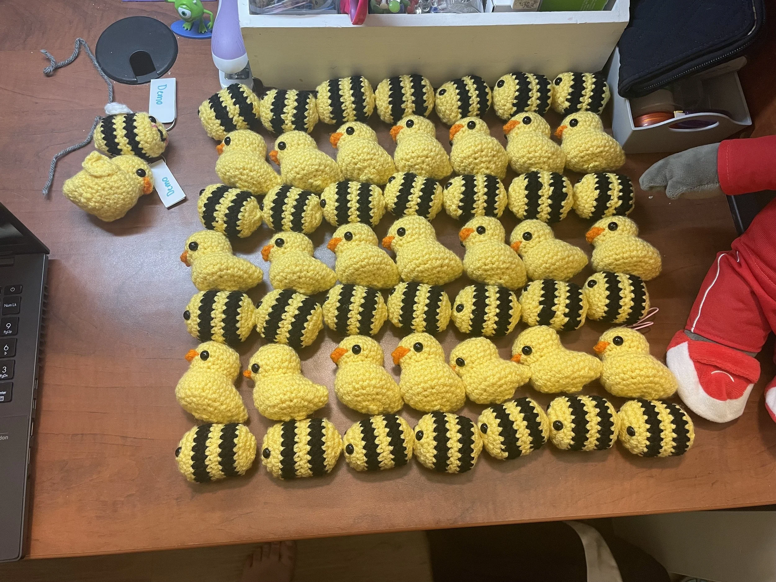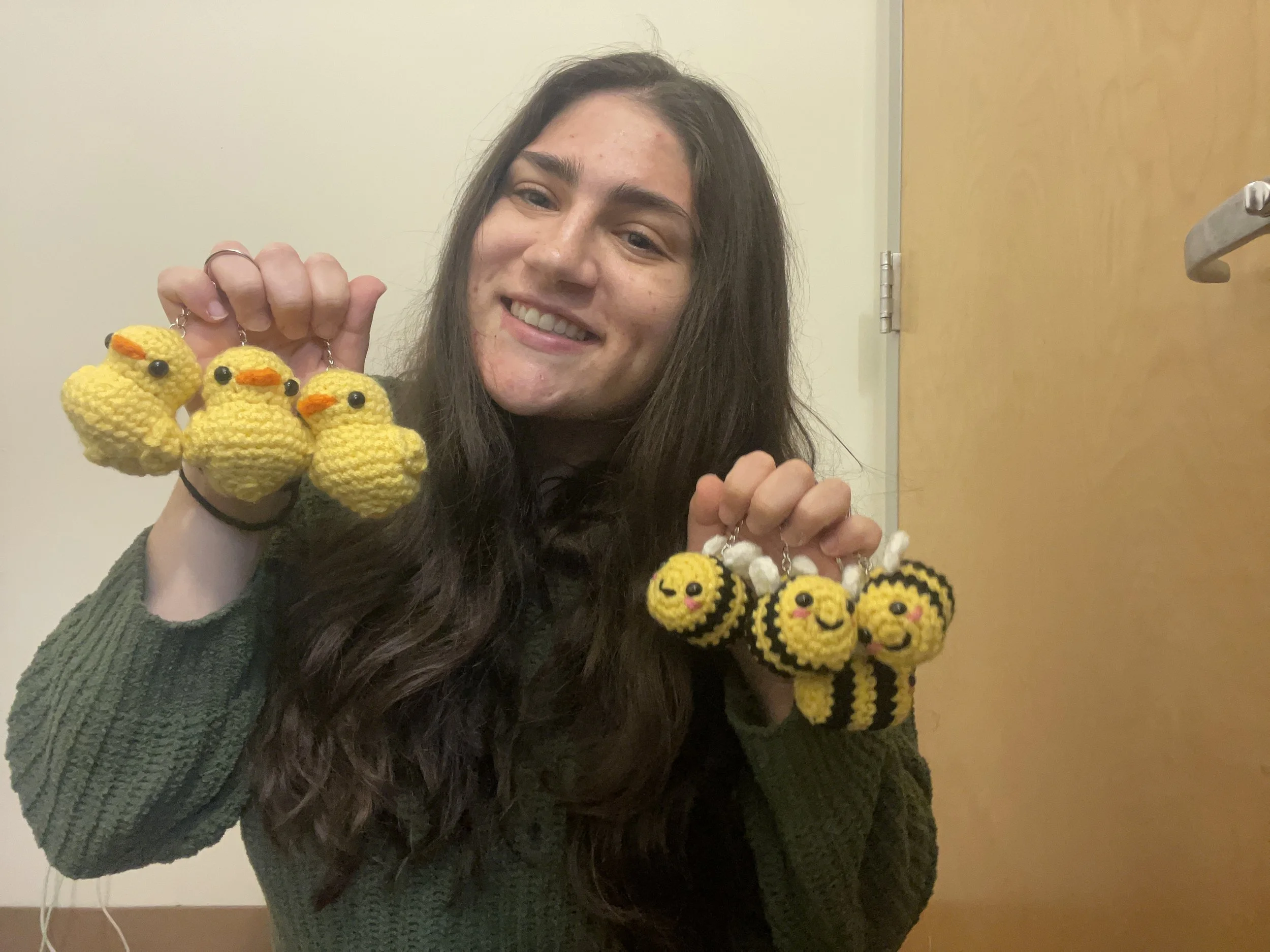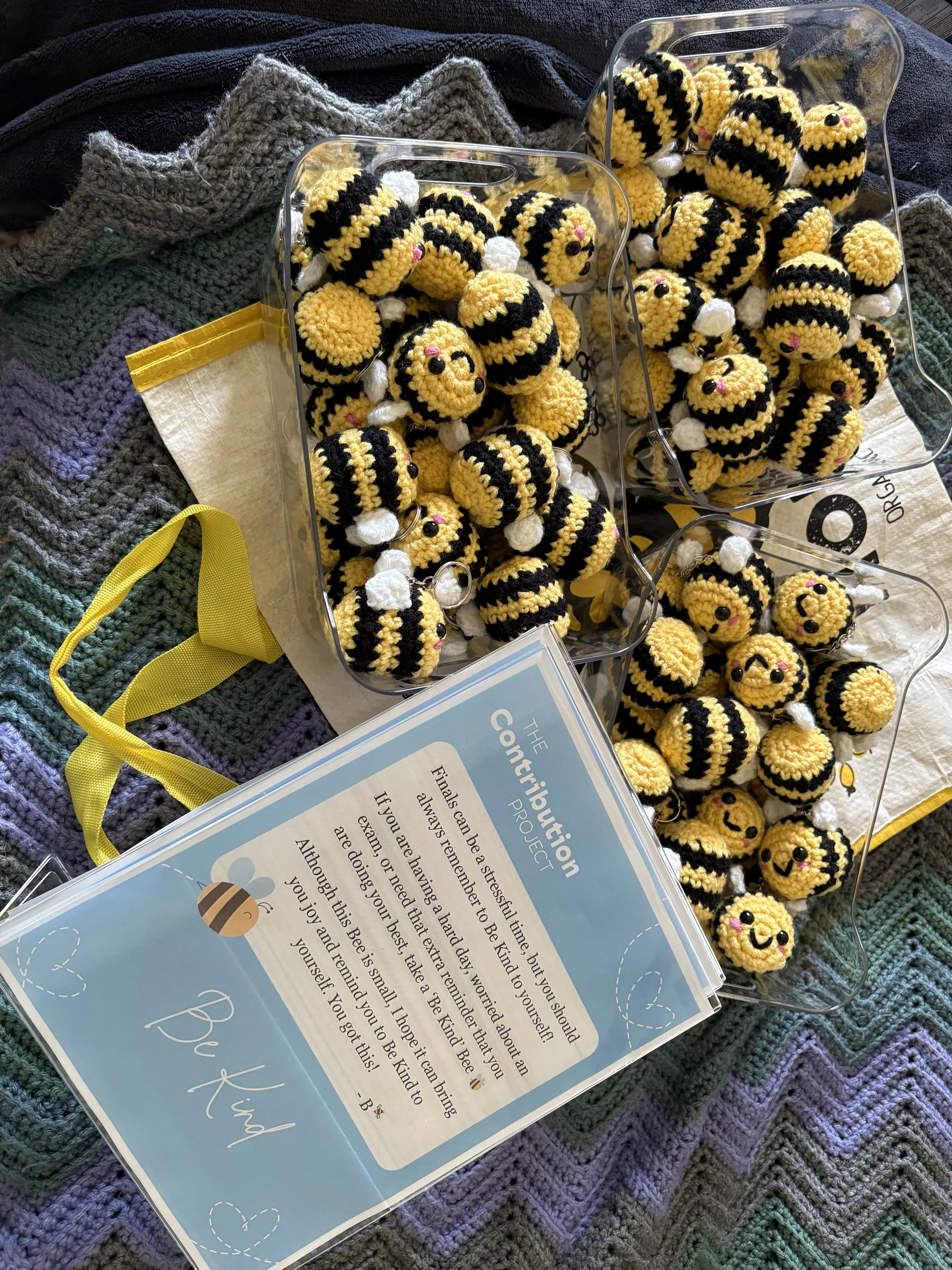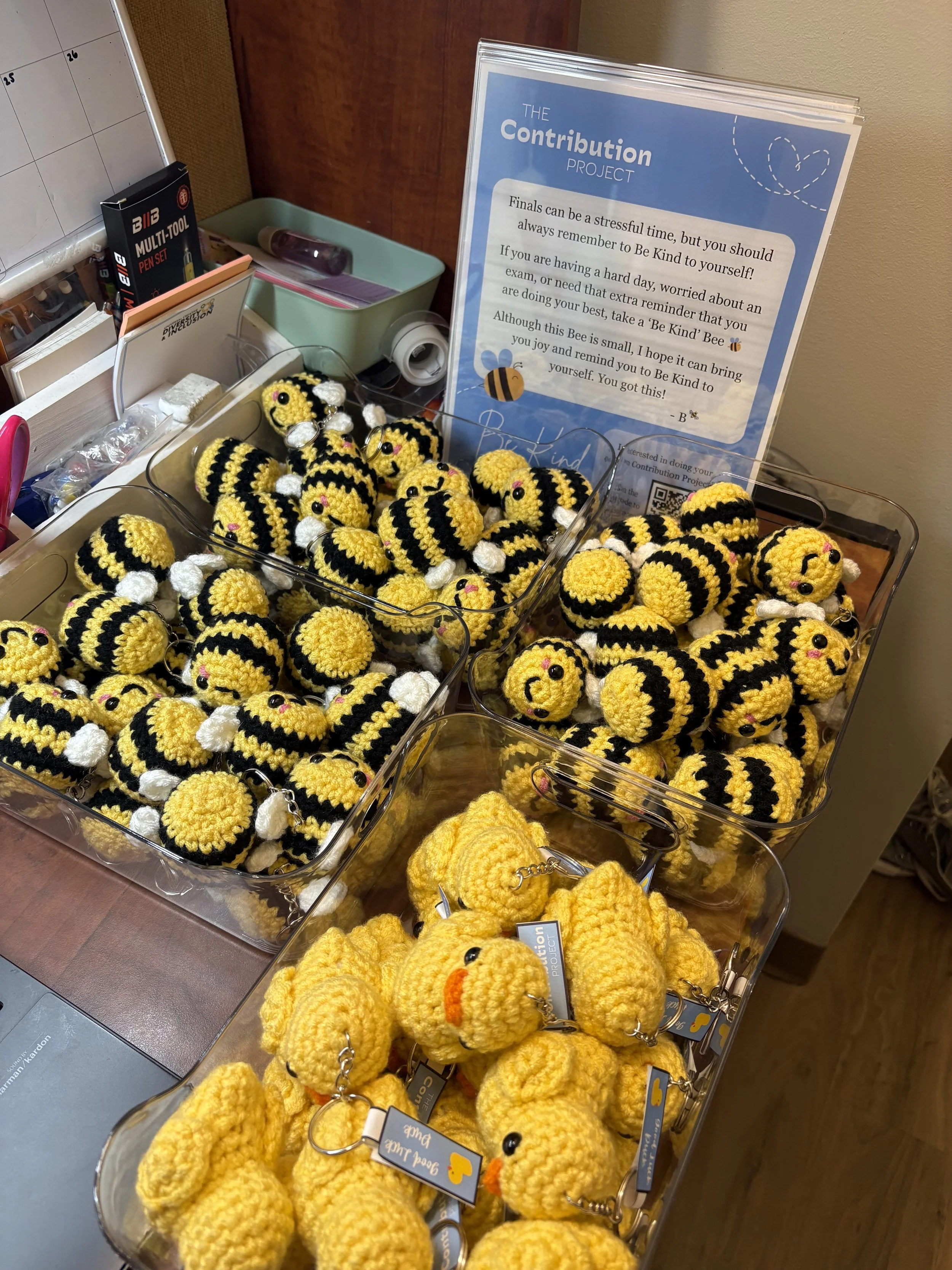 During finals week, Brooke crocheted “Be Kind Bees” and “Good Luck Ducks” keychains to encourage peers to care for their mental well-being. Drawing on their own experience with exam stress and support from the Student Accessibility and Support Center (SASC), they donated 75 Be Kind Bees to SASC and personally distributed additional bees and ducks across campus—over 120 keychains in total.